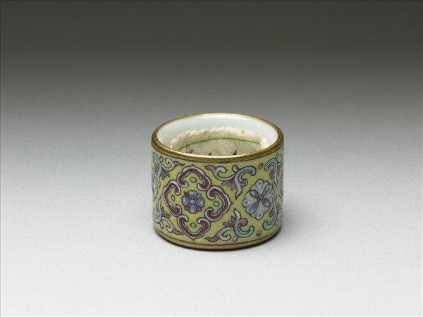 瓷胎,器作管狀扳指,兩端口徑略異,是為方便穿套手指之設計。上下口緣均飾金彩一圈,外壁施黃釉為地,彩繪如意花卉紋。此器一式十件,同儲於木匣中。