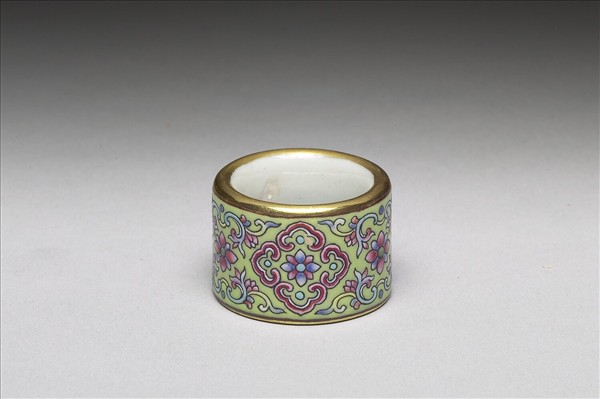 瓷胎,器作管狀扳指,兩端口徑略異,是為方便穿套手指之設計。上下口緣均飾金彩一圈,外壁施黃釉為地,彩繪如意花卉紋。此器一式十件,同儲於木匣中。