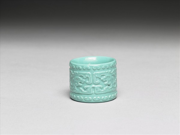 瓷質扳指,短管狀,唇口,一邊口緣較薄。通體施松石釉,外壁模印夔龍一周,上下夾飾如意雲紋。本器與仿松石紋扳指共十件,同儲於木匣中。