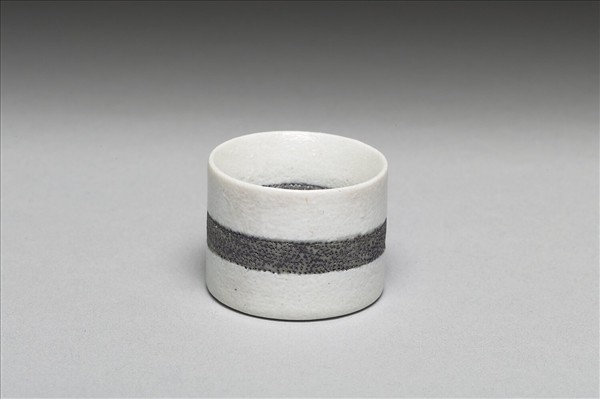 喇叭型,口徑一端較大,橫向上下平滑處施透明釉,中央內外戳刻小凹洞並施黑釉,仿鹿角骨製品。此器一式二十件,同儲一木匣。