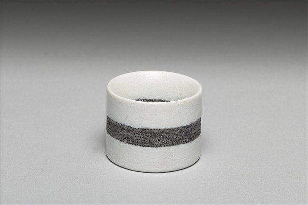 喇叭型,口徑一端較大,橫向上下平滑處施透明釉,中央內外戳刻小凹洞並施黑釉,仿鹿角骨製品。此器一式二十件,同儲一木匣。