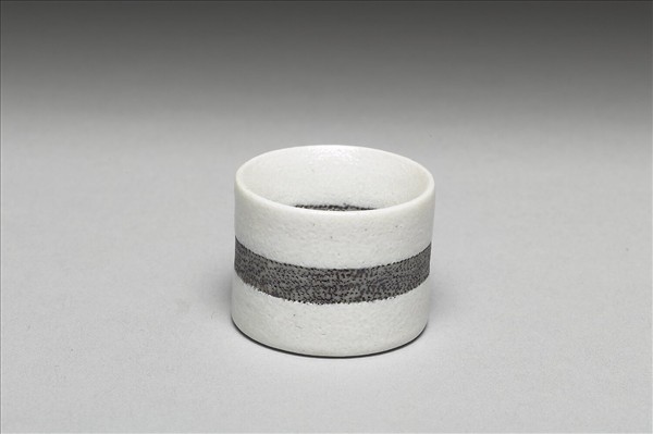 喇叭型,口徑一端較大,橫向上下平滑處施透明釉,中央內外戳刻小凹洞並施黑釉,仿鹿角骨製品。此器一式二十件,同儲一木匣。