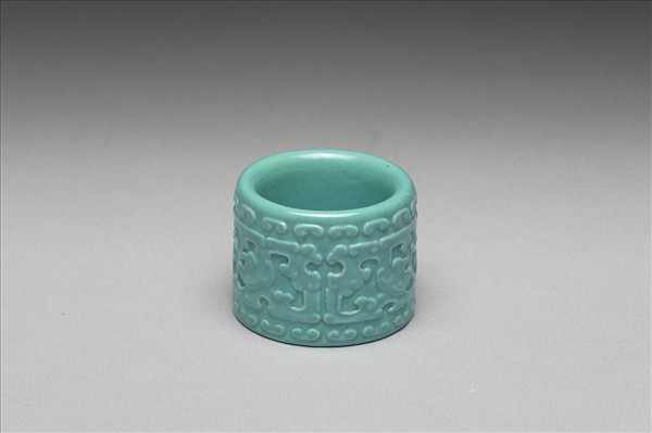 瓷質扳指,短管狀,口緣圓凸較壁為薄。通體施松石釉,外壁模印拐子龍一周,上下夾飾雲紋。此器與其他二十六件扳指一式同儲一木匣。