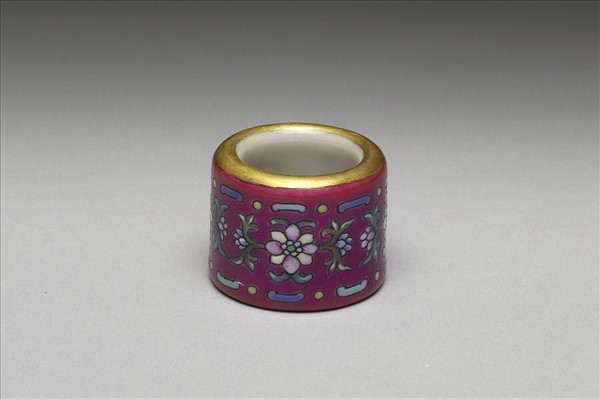 瓷胎,器作圓筒狀,兩端口徑略異,是為方便穿套手指之設計。上下口緣均飾金彩一圈,外壁施朱紅釉為地,繪多彩花葉為飾。此器與其他二十六件一式扳指同儲一木匣。