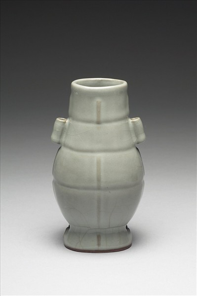 扁圓形壺,直口,削肩,夸腹,圈足,器身扁側肩部有雙貫耳,足部穿孔,為仿銅器壺形,原為穿繩攜帶用。以凹弦紋三道將器身分為四份,除有耳的第二段,餘三段皆平均作縱凸棱四道,通體施粉青色釉,勻亮光潔。圈足露胎塗茶色汁。