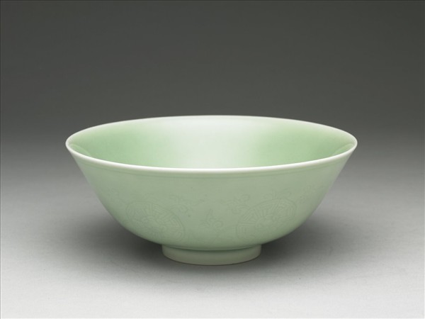 廣侈口,弧形壁,圈足。通體施青釉,呈冬青色,外壁刻飾轉枝花卉圖案,口緣並飾弦紋二周。底心白地青花篆款「大清嘉慶年製」,圈足露白胎,質堅細膩。