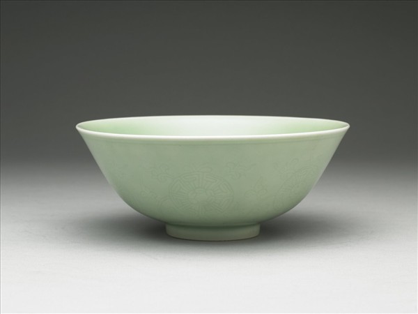 廣侈口,弧形壁,圈足。通體施青釉,呈冬青色,外壁刻飾轉枝花卉圖案,口緣並飾弦紋二周。底心白地青花篆款「大清嘉慶年製」,圈足露白胎,質堅細膩。