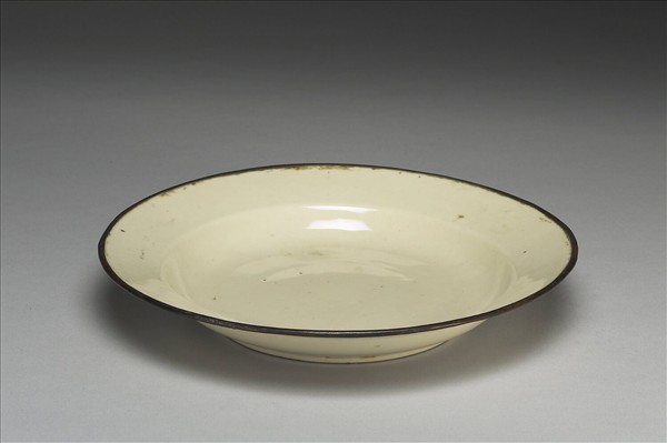 撇口折腰,淺弧壁,圈足,口緣鑲銅邊。通體施牙白釉,細膩勻潤。本件為覆燒。