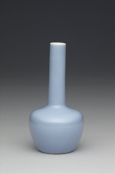 長頸、斜肩、短碩腹,底微凹、淺挖足。底以青花書「大清雍正年製」兩行楷款,外加雙圈。此件作品之形制與同時期造辦處生產之玻璃瓶極為相似。追溯歷史脈絡,也能夠遙遙呼應北宋汝窯青瓷紙槌瓶。器表之天藍釉色始燒於康熙時期,故此品可視為雍正官窯同時彙整仿古器形和康熙釉彩之作。