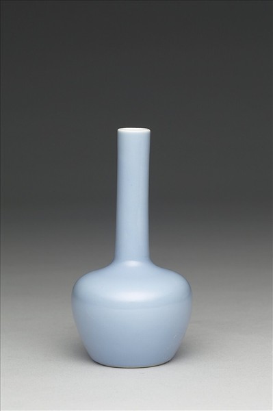 圓口,長直頸,豐肩下斂,底凹為足。整器施罩天藍色釉,釉色勻淨。底露胎一圈,中有白地青花雙圓框「大清雍正年製」兩行六字楷款。