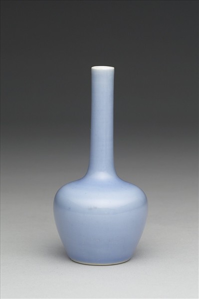 圓口,長直頸,豐肩下斂,底凹為足。整器施罩天藍色釉,釉色勻淨。底露胎一圈,中有白地青花雙圓框「大清雍正年製」兩行六字楷款。