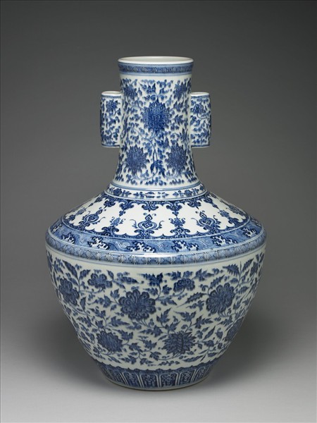 直口,直長頸,雙貫耳,斜肩,下折,碩腹下斂,平底,內挖為圈足。器身白地,以青花繪纏枝番蓮花、圓式朵花與寶相花等,並以回紋、波濤紋、變形蓮瓣紋相間隔,青花濃艷,蓄意於紋飾邊緣加點繪,仿如永宣滲青鐵鏽斑。底有青花「大清雍正年製」六字三行篆款,足緣露白胎。