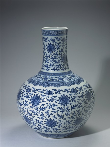 天球瓶,直口,直長頸,球狀肩腹,平底,內挖為圈足。器身白地,滿繪青花纏枝番蓮紋,口、肩、足處加飾卷草紋、回紋、轉枝花、如意雲紋及變形蓮瓣紋等。底有青花「大清雍正年製」六字篆款,足緣露白胎。