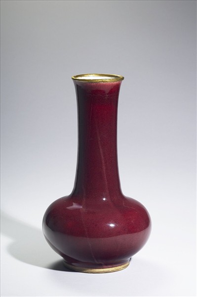 小撇口,直長頸,碩圓腹,圈足,口緣與足緣鑲銅鍍金邊。器身施紅釉,呈現宛如紅寶石般勻亮,舊稱「郎窯」,器裡與底白釉。質堅細膩。