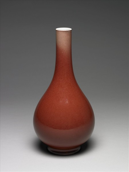 小口,細長頸,梨式腹,圈足。器身施紅釉,口緣釉色較灰淡,腹部深濃,器裡與底白釉。底青花書「大清雍正年製」六字楷款,加雙圈,足緣露白胎。