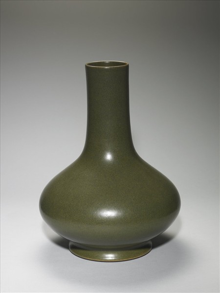 直口,長頸,斜肩,垂腹,矮圈足。全器施茶葉末釉,呈深橄欖綠色。足緣呈深褐色,底印「大清乾隆年製」三行篆書款。