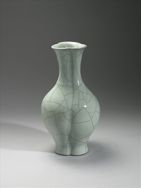 撇口,長頸,溜肩,斂腹,外撇圈足,刻三道棱線作三器相連狀。全器施仿哥釉,釉面上有開片裂紋,顏色深者較疏,淺者較密。圈足施醬褐色護胎汁。底青花書「大清乾隆年製」六字三行篆書款。