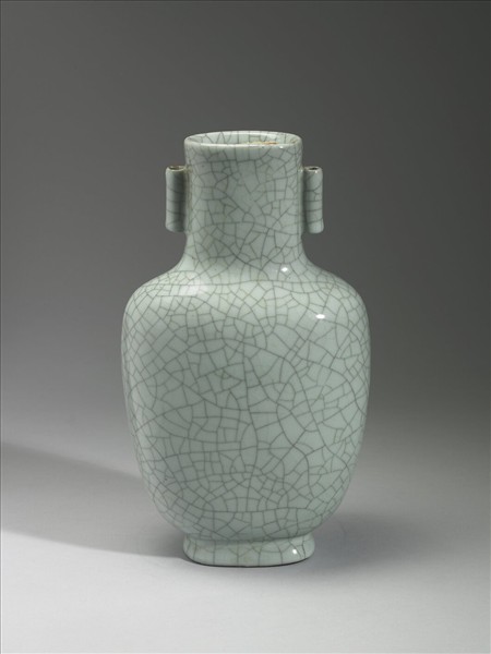 扁圓形,直口,直頸,附雙貫耳,斜肩,直腹,近足處微斂,方圓形圈足。全器施仿哥釉,釉面有細密灰色開片裂紋。圈足施醬褐色護胎汁。底青花書「大清乾隆年製」六字三行篆書款。