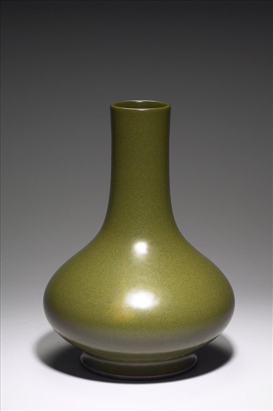 圓口略侈,直長頸,碩腹,圈足。通體施茶葉末釉,光素無紋飾。底亦施茶葉末釉,中印「大清乾隆年製」三行六字篆款。