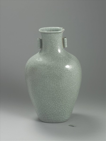 微侈口,短頸,雙貫耳,斜肩,橢圓腹,凹足。全器施仿哥青釉,釉面上有淺褐色開片裂紋。足緣呈褐色。底有模印陽文「大清乾隆年製」三行篆書款。