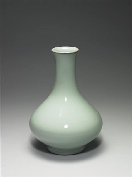 微撇口,長頸,斜肩,垂腹,矮圈足。全器施青釉,釉面有開片裂紋。足緣呈黑褐色。底有「大清乾隆年製」三行鈷藍篆書款。
