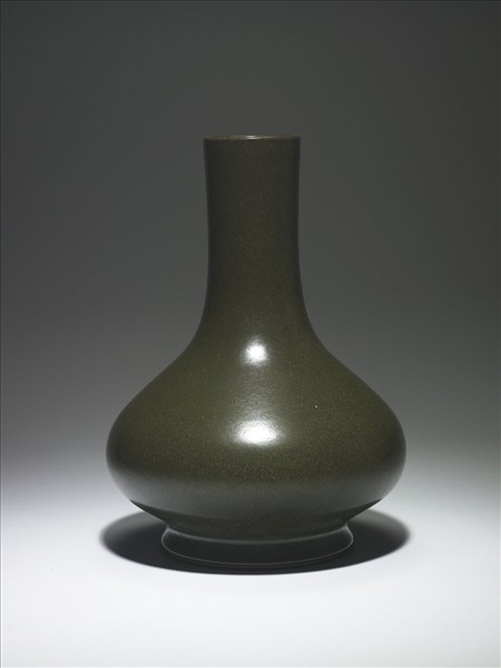 圓口略侈,直長頸,碩腹,圈足。通體施茶葉末釉,光素無紋飾。底亦施茶葉末釉,中印「大清乾隆年製」三行六字篆款。