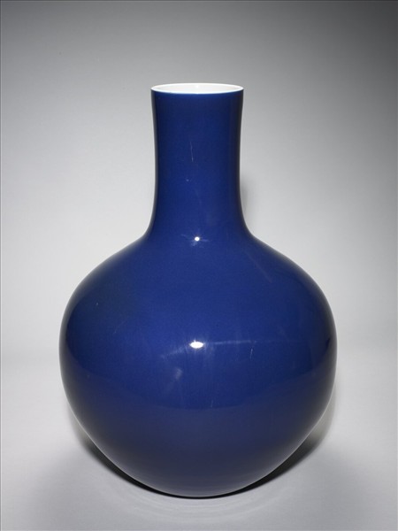 圓口微侈,長直頸,球腹。器表滿施霽青釉,器內及底均施白釉,釉色勻潤光亮。底有白地青花「大清乾隆年製」三行六字篆款。