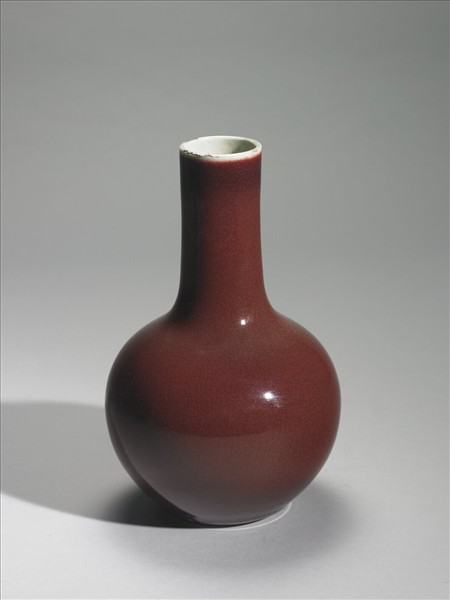 圓口,長直頸,鼓腹,圈足外撇。除口緣外,整器罩紅釉,發色如紅寶石,釉下可見細碎之開片紋。圈足露胎塗褐色汁一圈,足內白釉地青花書「大清乾隆年製」三行六字篆款。