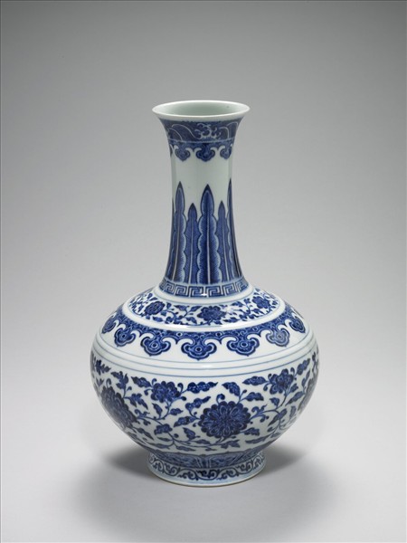 白地青花,侈口,長直頸,碩腹,圈足外撇。口緣飾波濤紋、如意雲頭紋,頸與腹外壁繪蕉葉、回紋、轉枝花葉、如意雲頭、纏枝花葉、蓮瓣紋為飾。圈足內白地青花「大清乾隆年製」三行六字篆款。