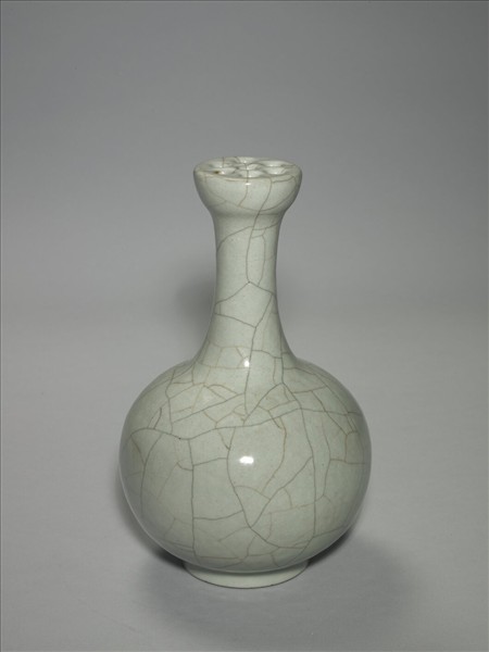 侈口直頸,碩腹,圈足,器口閉合、上開七個小圓孔,作插花用器。全器施灰青釉,釉色瑩潤,有大小開片紋。圈足露胎塗褐色汁一圈,圈足內青花書「大清乾隆年製」三行六字篆款。