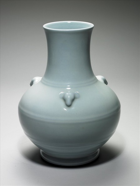 侈口,長頸,圓腹,圈足。肩部有三個羊首裝飾,頸、肩、腹部各有兩道突出弦紋。全器仿汝釉,釉面有細密淺褐色開片裂紋。足緣呈褐色。底青花書「大清乾隆年製」六字三行篆書款。