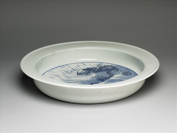 侈口,寬折沿,淺弧壁,平底。盤心青花繪一龍與大小三魚翻泳於波濤之間,鱗爪波紋細密有致,青花濃淡有層次。底露白胎,中黑藍色書「大清康熙年製」六字二行楷款,加雙圈。此魚龍組合又稱「魚龍變化圖」,魚躍成龍,象徵飛黃騰達、金榜題名。