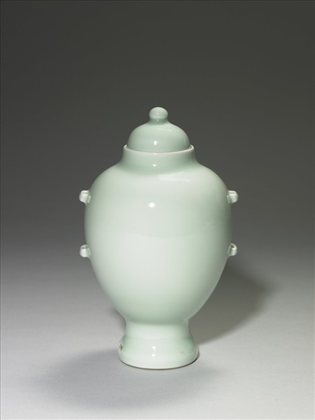 高足蓋罐,罐身作小口,短頸,豐肩,碩腹下歛,高撇圈足,圈足作二階式凹入,器腹二側各作橫穿二,圈足有長方形穿孔。通體施冬青釉,淺青勻亮。器底有青花書「大清雍正年製」六字三行篆款,足端露胎。口沿內折唇,與蓋子母口相合;蓋作圓頂珠鈕式。