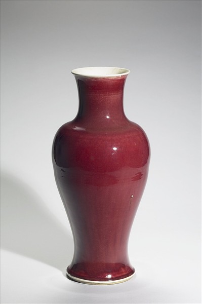 撇口,束腰頸,豐肩,碩腹下斂,足外撇。器身施霽紅釉,濃艷透亮,器裡與底施白釉。圈足露白胎。