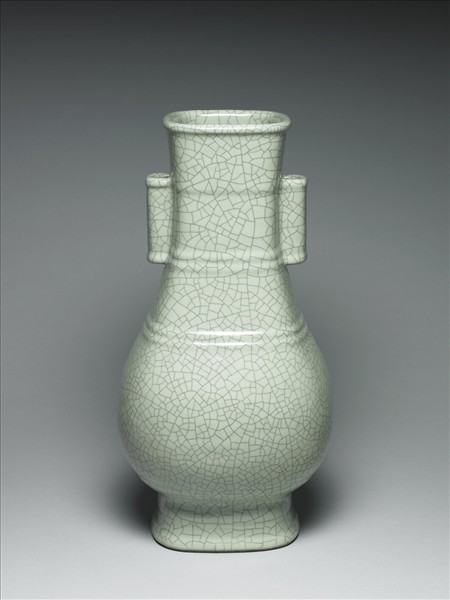 直口,長頸,削肩,夸腹,撇足,口頸與足作方形,肩上方形貫耳一對,帶耳兩側足上有長方形穿孔二。通體施青釉,器面滿佈淺灰色開片,口、頸、肩飾凸弦紋一或二周。器底施青釉,底心書「大清雍正年製」六字三行青花篆款,圈足露胎,塗赭色汁。