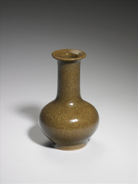 小口折唇,直長頸,碩腹,圈足,足上有長方形穿孔二。通體施茶葉末釉,光素無紋飾。底亦施茶葉末釉,中青花書「大清雍正年製」六字篆款,圈足露白胎。