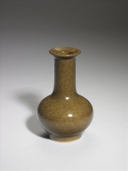 小口折唇,直長頸,碩腹,圈足,足上有長方形穿孔二。通體施茶葉末釉,光素無紋飾。底亦施茶葉末釉,中青花書「大清雍正年製」六字篆款,圈足露白胎。