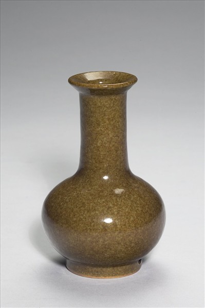 小口折唇,直長頸,碩腹,圈足,足上有長方形穿孔二。通體施茶葉末釉,光素無紋飾。底亦施茶葉末釉,中青花書「大清雍正年製」六字篆款,圈足露白胎。