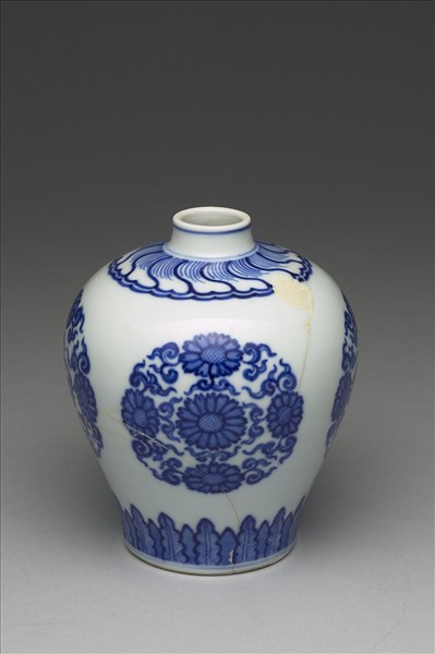 小口,短頸,豐肩,碩腹下斂,平底,器身有舊傷補。通體白地,腹部以青花繪五朵菊花構成團花四組,肩部飾葵瓣紋一周,足部蕉葉紋。底亦白地,以青花書「大清雍正年製」,加雙圈,圈足露白胎。