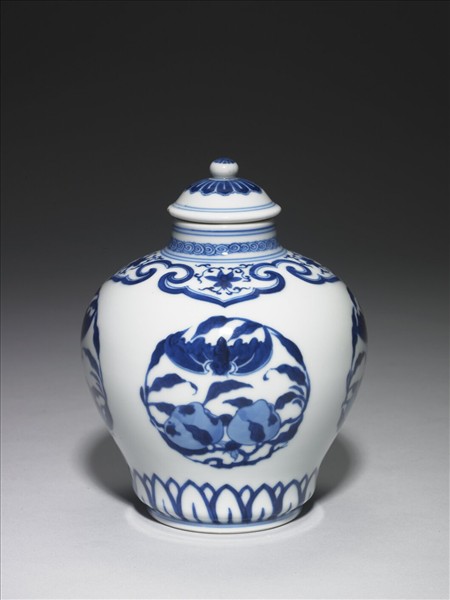 小口,短頸,豐肩,碩腹下斂,圈足,帶扁圓鈕笠式蓋。通體白地,腹部繪象徵福壽的蝙蝠雙桃團紋四組,肩頸飾連續圈紋與帶朵花如意雲紋,足部蓮瓣紋,蓋面繪花瓣紋。底白地,中青花書「大清雍正年製」,加雙圈,圈足露白胎。