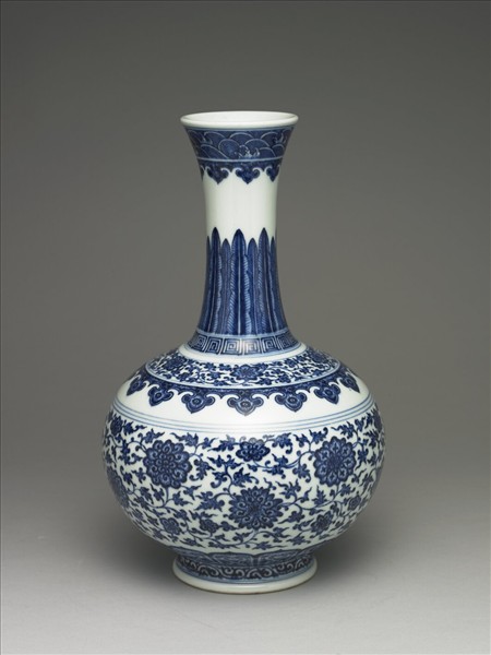 瓷胎,撇口,長頸,溜肩,圓腹,圈足。以青花繪為飾,口緣繪水波紋,下接一圈如意雲紋,頸部繪蕉葉紋,下接一圈回紋,肩部繪折枝番蓮紋及如意雲紋,腹部繪番蓮紋,下緣繪蓮瓣紋,圈足外繪卷草紋。足緣露胎,胎質緻密呈白色。底有「大清乾隆年製」三行鈷藍篆書款。