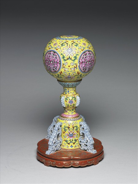 瓷胎,此冠架上為圓球狀的器身,鏤空而且可轉動的花薰,可放置各式香花或薰香,用以承放及薰香冠帽,頂上有一圓形子母口蓋,以銅片製作口緣及蓋;下為承座,有四夔龍足及仿木製圓盤底座。全器黃地,以五彩釉色繪製圖紋,以番蓮紋為主,球體四邊有鏤空粉紅蝙蝠紋,器形轉折處間以蓮瓣紋、如意雲紋、回紋、卷草紋等邊飾,中間部分有四道出戟裝飾。夔龍足以青花繪裝飾紋飾。仿木製圓盤底座繪金彩盤長紋、花卉紋、如意雲紋。足緣呈淺褐色,底為橘紅地金書「大清乾隆年製」三行篆書款。