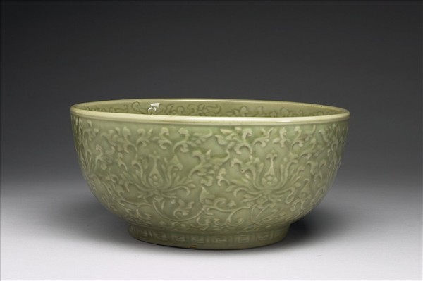 墩子碗,寬直口,圓唇棱,圈足。以刻花為飾,外壁作剔地拱花,浮雕出八朵連枝番蓮紋,花葉布置繁密;內壁則以陰線刻出相同的紋樣。內底平鋪寶相菊花,從格紋花心向外輻射雙層花瓣,剔刻細緻,使內層花瓣浮拱於外層花瓣上。圈足壁刻回紋一周。裹足滿釉,足裡環形無釉墊燒區。