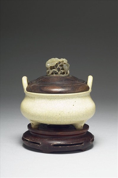 侈口,斂頸,雙立耳,夸腹,三鬲形足。通體施白釉,色牙白泛黃,光潤帶細密的淺灰色開片。三足底露胎,塗赭色汁。帶木蓋玉頂與木座。