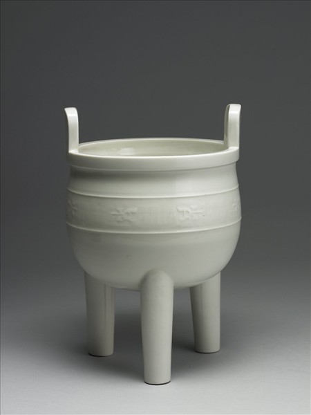 方唇口,雙立耳,深腹,圓底,下呈三中空柱形足。通體施白釉,釉質瑩潤,白中微泛乳黃色。腹部有兩道凸弦紋,中間印飾回紋地夔龍紋。足底露胎,質潔白細膩。