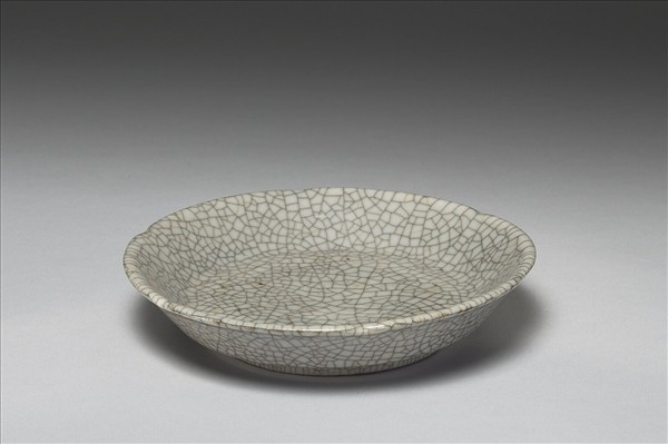 六瓣葵口,淺壁,圈足。全器施釉,釉色灰青略白,釉面佈滿褐色開片裂紋,足緣呈深褐色。