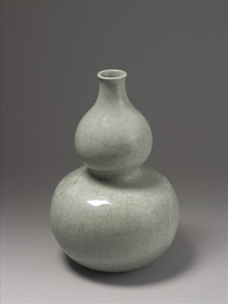 葫蘆形,微侈口,細頸,溜肩,葫蘆形圓腹,壁形足。通體施仿官青釉,釉色粉青帶灰,釉面帶淺褐色細紋開片,足部施醬褐色護胎汁。