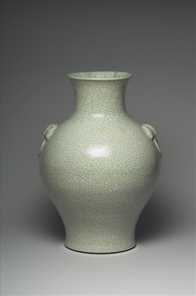 撇口,短頸,斜肩,肩兩側貼飾雙蝶啣環,腹上豐下斂,凹足。通體施仿哥青釉,釉面瑩潤細膩,滿佈細碎開片紋。足緣塗醬褐護胎汁。