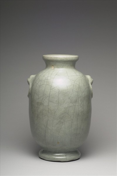 直口,短頸,斜肩,雙獸首啣環耳,橢圓腹,撇足。全器施灰青釉,釉面有大小透明、呈褐開片紋,以及縮釉痕。胎體厚重,釉層腴厚,足底塗深褐護胎汁。