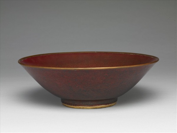 侈口,斜直壁,圈足,口緣鑲銅邊一圈。通體施霽紅釉,釉色暗紅帶橘皮現象,全器光素不加紋飾。底外施茶色釉,足跟無釉,露白砂胎。